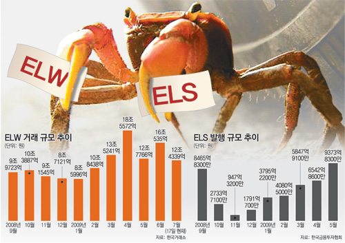 최근 증시의 두드러지는 특징 중 하나는 파생상품의 거래가 크게 늘었다는 점이다. 특히 원금 손실 위험이 높아 한동안 투자자들에게 큰 인기를 끌지 못했던 주식워런트증권(ELW)과 주가연계증권(ELS)의 거래가 지난해에 비해 크게 증가했다. ELW는 미리 정한 시점에 특정 가격으로 주식을 매입(콜·call) 또는 매도(풋·put)할 수 있는 권리로 콜 ELW는 주가가 오르면 이익을 내고 풋 ELW는 주가가 떨어지면 이익을 내는 구조다. 수익률은 높지만 손실 가능성도 높아 고위험 상품으로 분류된다.