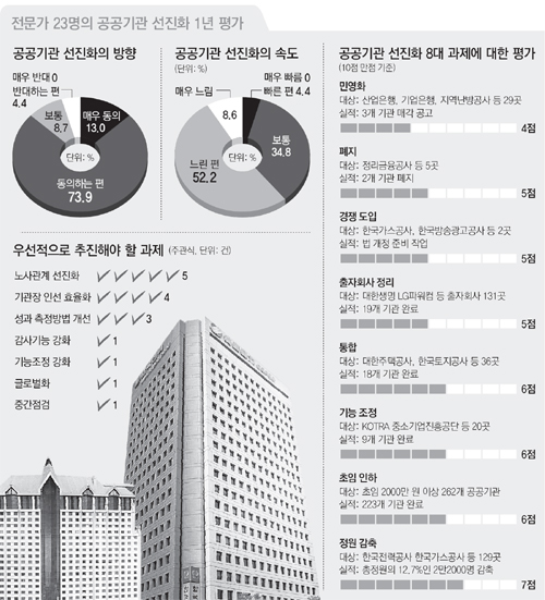 동아일보는 ‘2008 공공기관장 평가’에 참여한 7명과 한국공기업학회 회원 16명 등 23명의 전문가를 상대로 공공기관 선진화 정책에 대한 설문조사를 했다. 설문 결과 정책의 방향에 대해선 86.9%가 동의했다. 하지만 선진화 속도에 대해선 매우 느림(8.6%)과 느린 편(52.2%)이란 응답이 전체의 60.8%를 차지했다.