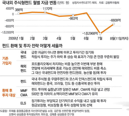 이미 환매를 한 투자자 중에는 마땅한 투자처를 찾지 못해 머니마켓펀드(MMF)나 종합자산관리계좌(CMA) 같은 단기 투자처에 잠시 맡겨두면서 시장을 관망하는 이들이 많다. 그러나 은행의 정기예금 금리가 연 3% 남짓한 상황에서 주식이나 펀드를 대체할 만한 투자처가 거의 없는 게 현실이다.