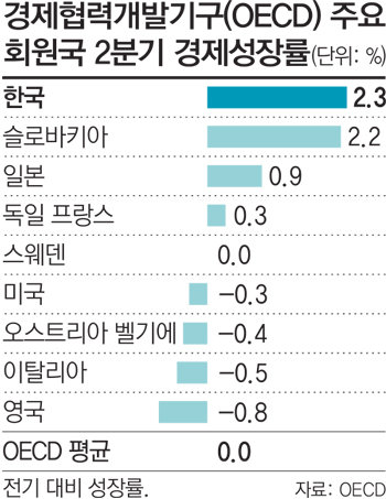 20일 기획재정부에 따르면 OECD는 한국의 2분기 경제성장률이 전기 대비 2.3%로 지금까지 2분기 성장률을 발표한 17개국 중 가장 높은 것으로 나타났다고 밝혔다. 슬로바키아(2.2%) 일본(0.9%) 독일 프랑스 체코 포르투갈 그리스(이상 0.3%) 등이 뒤를 이었다.
