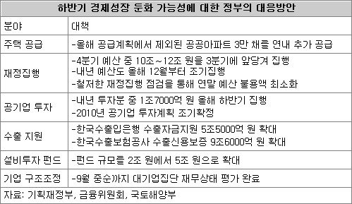 정부는 3일 청와대에서 이명박 대통령 주재로 열린 비상경제대책회의에서 이런 내용이 담긴 ‘최근 경제상황에 대한 재정부문 대응방안’을 확정했다. 기획재정부 당국자는 “기업 설비투자 부진과 세계 경제의 회복 지연 등으로 하반기에 경제성장이 둔화될 가능성을 배제할 수 없어 4분기 예산을 3분기에 앞당겨 집행하고 주택 공급을 늘리기로 한 것”이라고 설명했다.