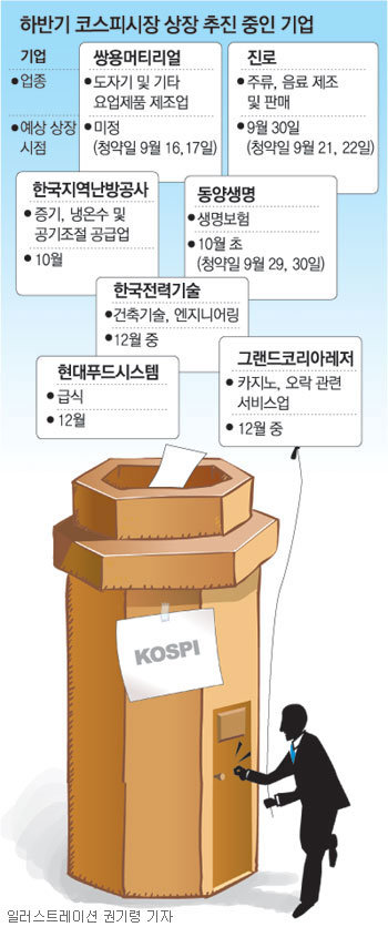 상장을 앞둔 기업 중 가장 눈에 띄는 곳은 진로다. 국내 소주시장 1위인 진로는 1973년 거래소에 상장됐으나 외환위기 때 어려움을 겪은 뒤 2003년 상장 폐지됐다. 진로는 이달 21, 22일 이틀간 청약을 받은 뒤 30일 코스피시장에 재상장된다. 공모가는 기관투자가 등과의 면담을 통해 최종 결정된다. 증권업계의 공모 예상가는 주당 5만∼6만 원. 9일 현재 장외 시장에서 매수 기준으로 7만2000원대에 거래 중이다.