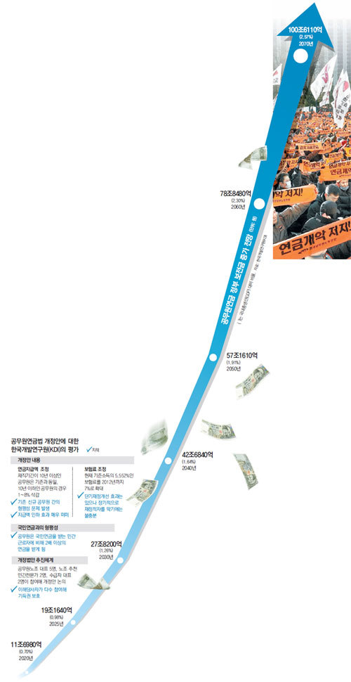이 가운데 전공노와 민공노는 최근 통합공무원노조를 결성한 데 이어 민주노총에 가입하면서 임금인상과 공무원연금법 개정 저지, 구조조정 차단 등을 가입 배경으로 내세웠다. 이미 변질된 개정안마저도 반대한다는 뜻으로 향후 공무원연금 개혁의 험로를 예고하는 셈이다.