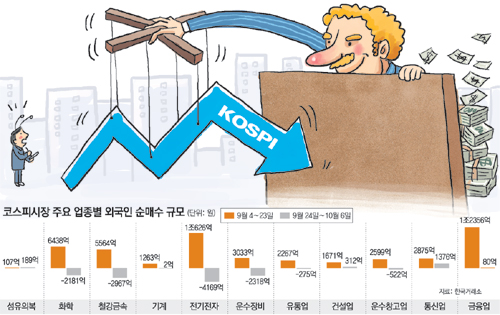 한국거래소의 집계에 따르면 외국인은 9월 초중순의 매수기에 사놓은 주식을 이후 매도기에 도로 내다 파는 양상을 보였다. 외국인이 9월 4∼23일 주로 사들인 업종은 금융(1조2356억 원) 전기전자(1조626억 원) 화학(6438억 원) 철강금속(5564억 원) 운수장비(3033억 원) 등이었다. 종목으로는 삼성전자(6094억 원)를 비롯해 포스코 KB금융 신한지주 등을 주로 샀다.