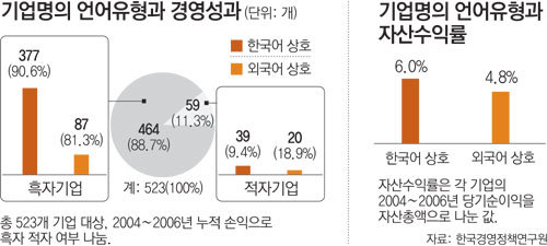 이들 기업의 2004∼2006년 실적을 비교 분석한 결과 한국어 이름을 사용한 기업 중 3년간 누적 실적으로 흑자를 낸 기업은 90.6%(377곳)인 반면 외국어 이름을 사용한 기업 중 흑자 기업은 81.3%(87곳)였다. 같은 기간 기업이 자산을 얼마나 효율적으로 운용해 성과를 냈는지를 보여주는 자산수익률에서도 한국어 이름 기업이 6.0%로 외국어 이름 기업 4.8%보다 높았다. 이승우 신영증권 연구위원은 “고수익 기업군이 아닌 경우 자산수익률 격차가 1.2%포인트 정도면 의미 있는 차이라고 볼 수 있다”고 설명했다.