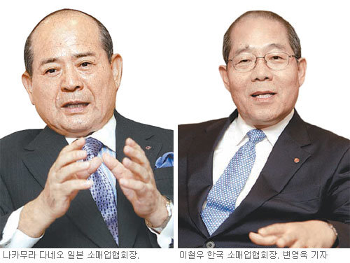 《백화점의 미래는 어디에 있는가. 대한상공회의소 주최로 14∼16일 서울 강남구 삼성동 코엑스에서 열리는 ‘제14회 아시아태평양 소매업자대회’ 참석차 방한한 나카무라 다네오(中村種南) 일본 소매업협회장과 이철우 한국 소매업협회장(롯데쇼핑 대표이사)이 13일 만났다. 도쿄 상공회의소 고문과 일본 최초 백화점 미쓰코시(三越)의 최고경영자(CEO)를 지낸 나카무라 회장은 이날 서울 중구 소공동 롯데쇼핑을 방문해 이 회장과 1시간 반 동안 이야기를 나눴다.》
