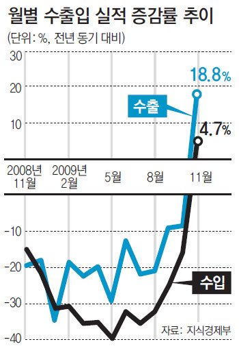 지식경제부가 1일 발표한 ‘2009년 11월 수출입 동향 및 평가(통관기준 잠정 집계)’에 따르면 수출은 전년 동월 대비 18.8% 증가한 342억7000만 달러, 수입은 4.7% 증가한 302억2000만 달러였다. 전년 동월 대비 수출과 수입은 지난해 11월 이후 계속 감소세였으나 처음으로 둘 다 증가하면서 이른바 ‘불황형 흑자’에서 벗어났다.