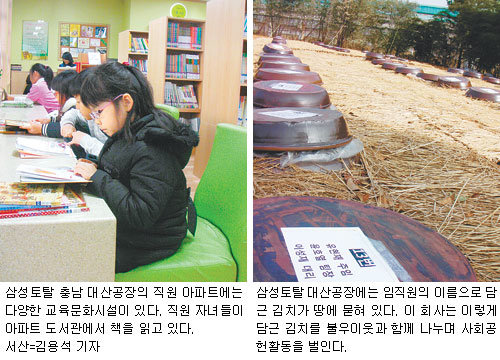삼성토탈이 최근 연 김장 담그기 행사도 부인들이 직접 마련했다. 김치를 담가 불우이웃에게 나눠준 뒤 나머지는 대산공장 마당에 묻어 놓고 점심시간마다 회사 식당에서 꺼내 먹도록 했다. 김칫독 뚜껑에는 김치를 담근 가족의 이름을 일일이 적어 놓았다. ‘○○팀 ○○○과장 가족이 담갔다’는 메모가 붙은 김치를 먹으면서 집에서 식사하는 기분을 느끼게 하려는 배려에서다.