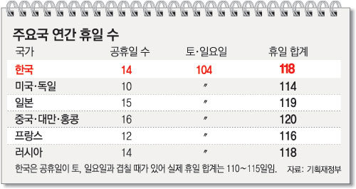 하지만 경제위기가 아직 끝나지 않은 시점에서 휴일을 늘리면 기업에 부담이 된다는 견해도 만만치 않아 재계를 설득하는 작업이 관건이 될 것으로 보인다. 이와 관련해 정부는 현재 14일인 공휴일을 12일 정도로 줄이는 대신 대체휴무를 통해 휴일을 확실하게 보장하는 방안을 대안으로 검토하고 있다. 재정부 관계자는 “제도를 개편하면 휴일은 다소 늘겠지만 그렇다고 꼭 생산성이 떨어지는 것은 아니다”라고 말했다.