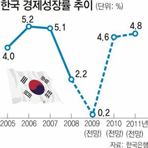 이날 한은이 내놓은 ‘2010년 경제전망’ 자료에 따르면 올해 경제성장률은 0.2%로 1998년(―6.9%) 이후 11년 만에 가장 낮은 수준으로 떨어지지만 내년에는 4.6%로 크게 상승할 것으로 예상된다. 2005년 4.0%였던 성장률은 2006년과 2007년 5%대로 높아졌다가 금융위기가 발생한 지난해 2.2%로 떨어진 뒤 올해는 성장세가 멈추다시피 했다.