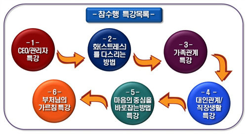 (사)참수행에서는 가정이나 직장, 대인관계 등 삶의 모든 면에서 성공하는 삶을 살아가고자 하는 사람들을 위하여 6가지 주제로 특별강좌를 개설해 운영하고 있다.
