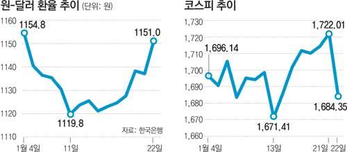 올해 초만 하더라도 서울 외환시장에서는 환율 하락 속도가 지나치게 빠르다는 우려가 높았다. 하지만 지금은 분위기가 바뀌었다. 원-달러 환율은 지난해 12월 30일부터 올해 1월 11일까지 51.40원 급락했으나 이후 오름세를 보이며 연초의 하락 폭을 만회해 왔다. 22일에도 원-달러 환율은 전날보다 13.90원이나 오른 1151원으로 마감하면서 4일(1154.80원) 이후 다시 1150원대로 올라섰다.