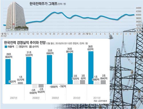 지식경제부가 10일 ‘전기요금 산정기준’ 고시를 개정해 모의시행 뒤 연료비 연동제를 내년에 전면 시행하겠다고 발표한 뒤 11, 12일 이틀간 한전 주가는 7.87% 뛰었다. 전기료를 유가와 환율 등의 변수에 맞춰 바꿀 수 있으면 수익성이 개선될 것이란 기대감 덕분이다.