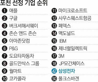 미국 경제전문지 포천은 최신호에서 ‘2010년 세계에서 가장 존경받는 기업 50곳’을 선정해 발표하면서 삼성전자가 지난해 50위에서 8계단 오른 42위를 차지했다고 밝혔다. 전자업체(Electronics) 순위에서는 지난해 9위에서 올해는 제너럴일렉트릭에 이어 2위를 차지해 무려 7계단이나 올랐다. LG전자는 전자업체 7위, 현대자동차는 자동차업체(Motor Vehicles) 5위에 올랐으나 전체 순위 50위 안에는 들지 못했다.