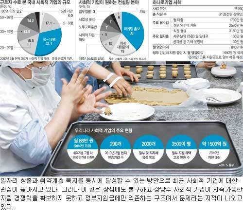사회적 기업 육성을 전담해온 노동부도 최근 이 같은 문제를 인식하고 제도 개선에 나섰다. 노동부 관계자는 “‘사회적 기업=지원’이라는 인식을 타파하려 노력하고 있다”며 “앞으로 매년 인증 조건 유지 여부에 대한 재심사를 진행하고 지원금을 단계적으로 줄이는 대신 경쟁력 강화를 지원하는 방안을 생각하고 있다”고 밝혔다.