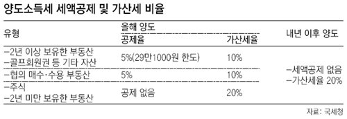 국세청 관계자는 “지난해까지 부동산을 양도한 후 2개월 안에 양도세를 신고·납부하면 10%를 깎아줬지만 올해부터는 공제가 없어졌고 대신 신고를 안 하면 가산세를 물어야 한다”며 주의를 당부했다. 국세청은 잘 몰라 발생하는 납세자들의 피해를 막기 위해 1월에 부동산 등을 양도한 것으로 확인된 납세자 4만2495명에게 최근 예정신고 안내문을 보냈다.