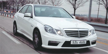 이번엔 독일에서 방금 날라 온 따끈따끈한 ‘E63 AMG’(사진)를 타봤다. 설레는 마음으로 ‘Engine Start’ 버튼을 누르자 6.2L V8엔진이 ‘으르렁’거리며 깨어난다. 적막하던 넓은 주차장은 소름 끼칠 정도의 매혹적인 배기음으로 가득 채워진다. 운전석으로 들어가 보자. 이전 모델인 ‘E55 AMG’와는 실내 분위기가 많이 달라졌다. 특히 고성능 분위기를 연출하는 장치들이 추가돼 즐거움을 더해준다. 우선 ‘AMG’ 버튼이 새로 생겼다. 이 버튼을 누르면 전자제어식 서스펜션의 감쇄력은 가장 강한 ‘스포츠 플러스’로 바뀌고 전자식 차체자세제어장치(ESP)도 스포츠 모드로 변경돼 공격적으로 차를 몰 수 있도록 해준다. 또 운전자가 임의로 서스펜션은 3단계, 변속모드는 4단계로 조절이 가능하다. 여기에다 굽은 길을 돌아나갈 때 몸이 쏠리지 않도록 자동으로 시트의 옆 부분이 솟아오르는 다이내믹 기능과 마사지 서비스도 들어 있다.
