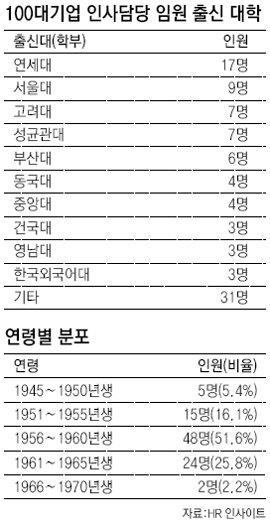조사 결과 국내 100대 기업에서 인사 업무를 지휘하는 임원의 평균 나이는 51.7세로, 1959년 출생 임원이 12명으로 가장 많았다. 이어 1956년생과 1960년생이 각각 11명, 1958년생 9명 등의 순이었다. 이 가운데 박해룡 LS산전 이사가 1970년생으로 최연소 CHO로 꼽혔다.