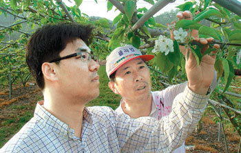 4일 문상윤 롯데마트 과일 담당 상품기획자(MD·왼쪽)가 경남 합천군 율곡면의 한 배 농가에서 배꽃을 살펴보고 있다. 사진 제공 롯데마트