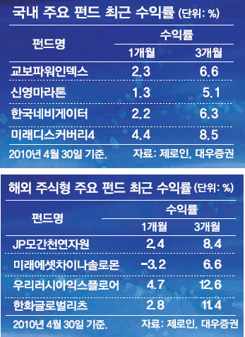김혜준 대우증권 연구원은 “일반형과 인덱스, 성장형과 가치형의 포트폴리오를 유지한 상태에서 각자의 성향에 따라 위험 관리를 하는 것이 좋다”고 말했다. 김 연구원의 추천 펀드는 한국네비게이터(일반), 신영마라톤(가치), 교보파워인덱스파생(인덱스), 미래디스커버리4(성장) 등이다.