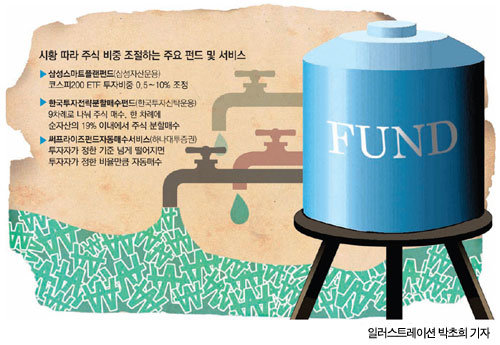 주가가 조정 양상을 보일 때마다 주식을 싸게 매수하려는 투자자들이 많아지자 이런 투자자의 입맛에 맞춘 새로운 형태의 펀드들이 나오고 있다. 삼성자산운용은 거치식으로 목돈을 맡기면 시황에 따라 매달 주식투자 비중을 자동으로 조절해 주는 ‘삼성스마트플랜 펀드’를 14일까지 판매한다. 이 펀드는 매월 일정한 소액을 투자하는 기존 적립식 펀드와 달리 먼저 거치식으로 목돈을 맡기면 이 돈의 대부분을 국공채 등 우량 채권에 투자하고 나머지를 코스피200 관련 ETF에 적립식으로 투자한다.