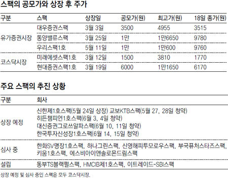 한때 공모가의 2배 이상을 넘기며 급등했던 스팩 주가는 대부분 공모가 부근으로 떨어졌다. 상장 후 적어도 1년은 지나야 인수합병(M&A)이 가시화되기 때문에 그 이전에 스팩 주가가 공모가 근처에서 맴도는 것은 자연스러운 현상이다.