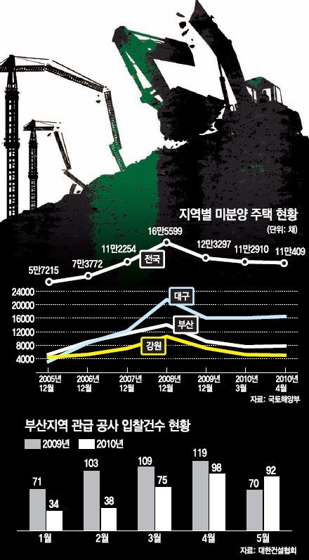아파트 등 주택건설 실적은 2006년 4만7081채를 정점으로 2007년 3만6620채, 2008년 1만3594채, 2009년 6460채, 올해 5월 현재 2253채로 급격히 줄었다.