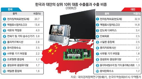 2009년 한국무역협회(KITA) 무역통계 기준으로 한국과 대만의 대중 수출 품목을 비교해보면 상위 20개 중 14개가 겹치는 것으로 나타났다. 양측에서 겹치는 14개 품목이 한국의 대중 수출에서 차지하는 비중은 60%가량이나 된다. 물론 이 중 양측이 모두 1위 품목인 전자집적회로(반도체)는 중국이 무관세로 하고 있는 품목이어서 양안 간에 ECFA가 체결돼도 영향이 없다.