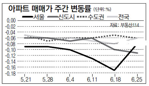 분당과 산본 등 신도시의 아파트 매매가가 거래 부진으로 하락세를 거듭하고 있다. 서울은 송파 강동지역의 재건축아파트에서 급매물이 나오면서 하향 조정됐다. 서울 재건축아파트는 한 주간 0.14% 떨어졌다. 27일 부동산114에 따르면 지난주 서울 아파트 매매가는 0.08% 하락했다. 마포(―0.22%) 송파(―0.19%) 노원(―0.19%) 양천(―0.14%) 강동(―0.11%) 성북구(―0.10%) 등에서 주로 가격이 떨어졌다.