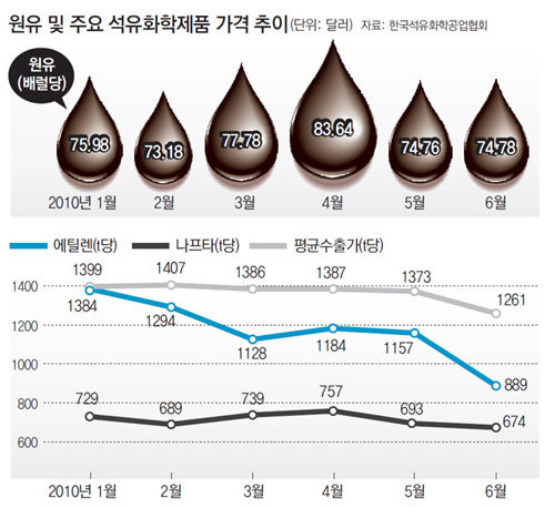 중동과 중국에서 물량이 쏟아져 나오면서 국제 에틸렌 가격은 6월 들어 급락했다. 한국석유화학공업협회에 따르면 올해 1월 t당 1384달러였던 에틸렌은 6월 889달러로 가격이 절반 가까이 뚝 떨어졌다.