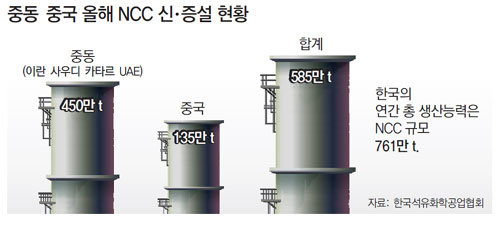 중동과 중국이 올해 상반기에 신·증설한 NCC는 각각 300만 t과 135만 t 규모다. 아랍에미리트(UAE)는 올 4분기(10∼12월)에 150만 t 규모의 NCC를 완공할 예정이어서 올해에만 총 585만 t 규모의 신규 설비가 만들어진다. 이는 국내 에틸렌 연간 생산시설 규모인 761만 t의 77%에 해당하는 수치다.