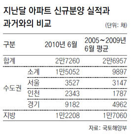 국토해양부는 올 1월부터 6월까지 전국에서 분양된 아파트는 모두 12만4009채로 이 가운데 수도권이 8만4558채, 지방은 3만9451채로 집계됐다고 1일 밝혔다. 수도권은 지난 5년 평균보다 50% 증가했지만 지방은 약 40%나 감소했다.