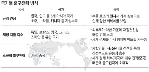 경제회복이 빠른 국가들은 금리인상을 통해 시중에 풀린 돈을 거둬들이고 있다. 금리인상은 주로 아시아권에서 두드러진다. 유럽은 재정지출 축소를 통해 출구전략에 나서고 있는 반면 세계경제의 양대 축인 미국과 중국은 출구전략에 조심스러운 모습이다. 각국이 처한 경제상황에 따라 각기 다른 출구전략을 추구하고 있는 것이다.