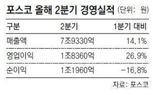 한편 포스코의 2분기 매출액은 7조9330억 원으로 1분기(1∼3월)보다 14.1%, 영업이익은 1조8360억 원으로 26.9% 증가했다. 회사 측은 “올해 들어 원료가격이 급등했으나 저가 원료 사용기술 등을 적용해 상반기에만 6804억 원의 원가를 절감했다”며 “이는 올해 절감 목표액의 59%로 원료가격 상승을 대부분 상쇄하는 규모”라고 설명했다. 포스코는 올해 매출액과 영업이익이 지난해보다 각각 24%, 81% 늘어난 33조5000억 원과 5조6000억 원이 될 것이라고 전망했다.
