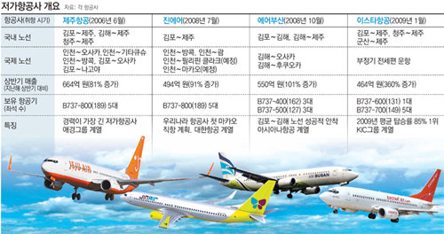 제주항공, 진에어, 에어부산, 이스타항공 등 국내 4개 저가항공사가 상반기(1∼6월)에 ‘화려한 경영실적’을 보이며 날로 커지는 저가항공 시장에서 본격적인 경쟁을 벌이고 있다. 특히 국내 최초 저가항공사이면서 경영난으로 지난 2년 동안 운항을 중단한 한성항공이 이르면 10월 운항을 재개할 예정이어서 저가항공사들의 ‘춘추전국시대’를 예고하고 있다.