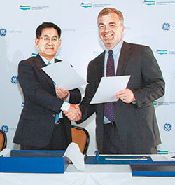 두산중공업은 미국 제너럴일렉트릭(GE)과 손잡고 차세대 원자력발전용 설비를 함께 개발하기로 했다고 18일 밝혔다. 두산중공업은 현지 시간으로 16일 차세대 원전용 발전설비 공동개발을 위한 양해각서(MOU)를 체결했다고 설명했다. 두 회사는 한국이 독자개발한 제3세대 신형 원전 모델인 ‘APR1400’의 후속모델 ‘APR+’ 원전에 들어갈 1560MW급 대용량 증기터빈 발전기를 공동 개발할 계획이다. 두산중공업 측은 “2015년경 상용화를 목표로 하고 있다”며 “30여 년간 기술을 쌓은 우리 회사의 발전설비 제작 능력에 터빈 분야에서 세계 최고인 GE의 기술력을 더해 차세대 발전설비 개발에서 한 발 앞서갈 것”이라고 강조했다.