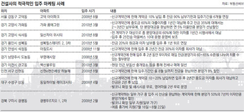 이에 따라 입주 마케팅도 입주 예정자의 성향 파악에서부터 생활, 중개, 법률, 세무, 금융서비스 등 입주민들이 필요로 하는 모든 것을 지원하는 ‘토털마케팅’으로 진화하고 있다. 부동산정보업체 부동산써브 함영진 실장은 “글로벌 금융위기 이후 분양률 개선을 위해 계약금 비중을 축소해왔던 건설사들로서는 입주 지연으로 잔금 납입에 문제가 발생하면 곧바로 유동성 위기에 직면할 수 있다”며 “이 같은 사태를 막기 위해 차별화된 입주지원서비스를 내세워 입주자들을 모으고 있는 것”이라고 말했다.