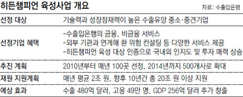 이날 간담회를 주최한 수출입은행의 김동수 은행장은 “10년간 매년 중소기업 100곳을 뽑아 이 중 30% 이상을 히든챔피언으로 성장시키겠다”며 “정부유관기관은 물론이고 대기업과의 협조체제를 통해 금융·비금융 분야에서 지원을 아끼지 않을 것”이라고 약속했다. 최영한 부행장도 “1년 뒤 평가를 거쳐 자체적인 노력이 부족한 회사는 히든챔피언 지원 기업에서 과감히 제외할 것”이라며 “국가경제의 중추가 되는 중견기업으로 성장할 수 있도록 최선을 다해 달라”고 말했다.