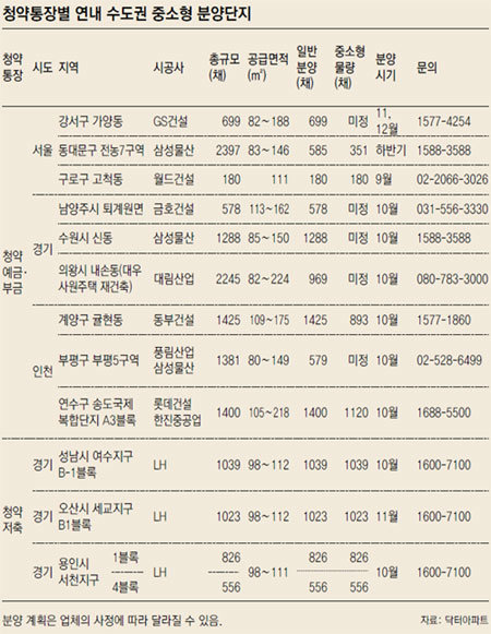 대림산업은 경기 의왕시 내손동 628 대우사원주택을 재건축해 2245채 중 82∼224m² 969채를 10월경 분양할 예정이다. 인근 대규모 재건축 단지들이 입주를 시작했고 롯데마트 안양농수산물시장 등 편의시설 이용도 편리하다. 롯데건설과 한진중공업은 인천 송도국제복합단지 A3블록에 1400채 규모의 대단지 아파트를 10월경 분양할 예정이다. 중소형은 105m² 1120채. 인천지하철 1호선 센트럴파크역과 송도국제학교가 가깝다.