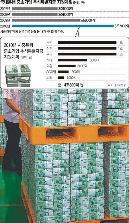 시중은행들은 매년 추석과 설 연휴 한 달 전부터 중소기업청과 금융당국에 중소기업 명절특별자금 지원 계획을 제출하고 있다. 친(親)서민, 중소기업 지원을 강조하는 정부 방침에 따르려다 보니 실제 중소기업 자금 수요나 은행들의 자금 지원 의지와 상관없이 전년도 자금 지원 계획보다 무조건 목표액을 늘려 잡으려는 압박이 만만치 않다. 실제 2007년 이후 시중은행 7개를 포함한 18개 국내은행의 추석특별자금 편성액은 매년 크게 늘고 있다.