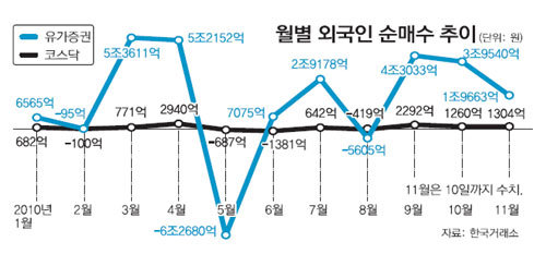 미국의 양적완화 정책 이후 한국을 포함한 신흥국으로 글로벌 유동성의 쏠림 현상이 계속되고 있다. 외국인투자가들은 9, 10월 한국 인도 인도네시아 필리핀 대만 베트남 등 신흥 아시아 6개국에서 모두 253억5400만 달러어치의 주식을 순매수했다. 국내에서만 74억5700만 달러어치를 사들이며 연고점을 경신하는 등 위력을 과시했다.