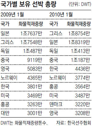 해운업체가 늘어나다 보니 한국이 보유한 선박 수와 선박의 총 화물적재중량톤수(DWT)도 크게 증가했다. 1991년 기준으로 한국은 선박 627척을 보유하고 1777만 DWT를 확보해 전 세계 9위를 기록했다. 18년이 지난 2009년 1월에는 1083척 보유에 3801만 DWT로 두 계단 상승했고, 올해 1월에는 1121척 보유에 4436만 DWT로 세계 5위에 올랐다. 1위는 3120척의 배를 보유하고 1억8754만 DWT를 확보하고 있는 그리스가 차지했으며, 2위는 일본으로 3668척 보유에 1억8319만 DWT였다. 3위는 독일, 4위는 중국이었다.