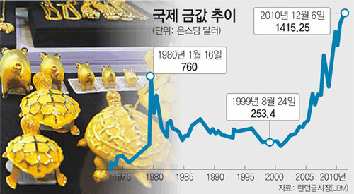 6일(현지 시간) 미국 뉴욕상업거래소에서 금 2월 인도분 선물가격은 전날보다 9.90달러(0.7%) 오른 31.1g(1온스)당 1416.10달러로 거래를 마쳤다. 6거래일 연속 상승한 국제 금값은 이로써 지난달 9일 기록한 최고가(1410.10달러)를 한 달여 만에 또 경신했다. 이날 금값은 장중 1429.4달러까지 치솟기도 했다. 국제 은값도 3월물 가격이 온스당 0.464달러(1.6%) 오른 29.74달러로 마감되며 사상 최고치를 돌파했다.