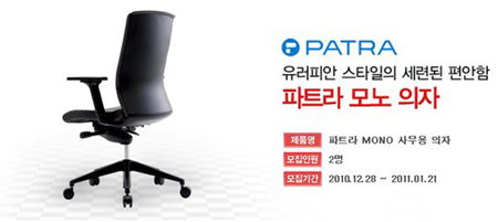 2010년 서울리빙디자인페어에서 신제품으로 선보인 사무용의자 MONO제품의 체험단 이벤트를 진행한다. 사무용의자 전문 브랜드 파트라는 와우커뮤니케티션의 ‘해피테스터’에서 파트라의 2010 신상품으로 선보인 유러피안스타일의 사무용의자 MONO의 체험단을 12월 28일부터 모집하고 있다고 밝혔다.