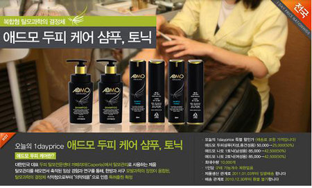 1dayprice는 29일 판매상품으로 식약청으로부터 탈모방지와 양모에 효과있는 ‘의약외품’으로 인정받은 ‘애드모액 두피샴푸’(지성, 중건성두피용 각 25,000)와 두피 건강에 유익한식물성추출물로 제조한 애드모 나모 토닉을 (42,500원) 내놓는다고 밝혔다.
