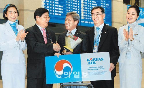 인천국제공항의 연간 이용객이 2001년 개항 이후 처음으로 3000만 명을 돌파했다. 이는 지난해보다 17% 늘어난 것. 인천공항출입국관리사무소와 대한항공은 29일 오전 3000만 명째 인천공항 이용객이 된 일본인 미무라 사다요시 씨(가운데)에게 꽃다발과 한일노선 비즈니스 왕복 항공권을 증정했다.