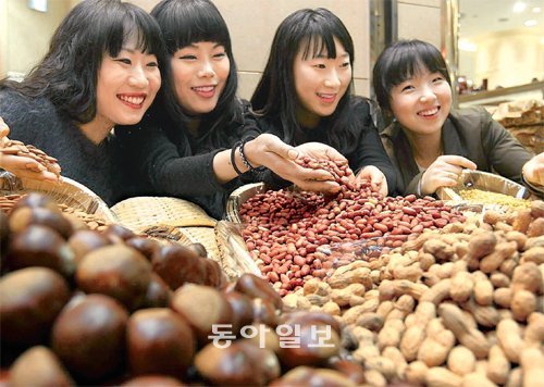 17일 정월대보름을 앞두고 무사태평을 빌며 단단한 껍데기를 깨무는 부럼 판매가 한창이다. 서울 중구 충무로1가 신세계백화점 본점 식품매장에서 고객들이 땅콩과 밤, 호두 등 부럼을 고르고 있다.