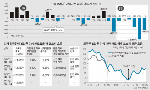 14일 외국인투자가들이 닷새 만에 ‘사자’로 돌아서면서 코스피가 2,000 선을 회복했다. 하지만 시장에서는 여전히 외국인들의 ‘셀(sell) 코리아’에 대한 우려가 높다. 지난해 ‘바이(buy) 코리아’에 나서며 상승세를 이끌던 외국인투자가들이 이달 들어 무려 2조4000억 원 이상을 순수하게 팔아치우며 코스피 급락세를 주도하자 매도세가 언제쯤 수그러들지에 관심이 쏠리는 것이다.