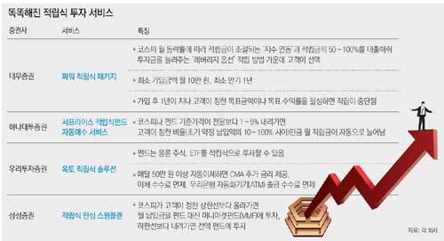 최근엔 적립식 투자 방법도 나날이 똑똑해지고 있다. 매달 일정 금액을 펀드에 넣는 방식에서 벗어나 상장지수펀드(ETF), 주식까지 적립식으로 투자할 수 있는 서비스가 잇달아 선보이고 있다. 또 주가 움직임에 따라 적립금이 조절되고, 적립금액을 담보로 투자금액을 늘려주는 서비스도 나오고 있다. 적립식 투자의 방법과 대상, 구조 등을 고객이 직접 선택할 수 있는 ‘맞춤형 적립식 투자’로 진화하고 있는 것이다.