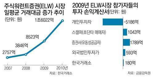 국내 ELW시장의 99%는 개인투자자다. 최계명 금융감독원 파생상품분석팀장은 “세계 어느 시장을 봐도 파생상품에 이렇게 많은 개인이 몰리는 곳은 없다”고 말한다. ELW시장에 개미들이 몰리는 것은 단기간에 수백 %의 초고수익을 낼 가능성이 있는 등 중독성이 강하기 때문이다. 하지만 ELW는 증권회사가 투자자의 수익과 직결되는 호가 간격, 유동성 공급물량을 조정하게 돼 있어 개인이 시장의 방향성, 변동성을 모두 고려해 수익을 올리기가 매우 어렵다. 적정가에서 벗어난 이상가격이 나타나도 방어할 수단이 없다. 실제로 2009년 개인투자자들이 5186억 원의 손실을 보는 동안 증권사는 1789억 원을, 스캘퍼는 1043억 원을 벌어들였다. ○ ‘곪아오던 문제가 수면으로’